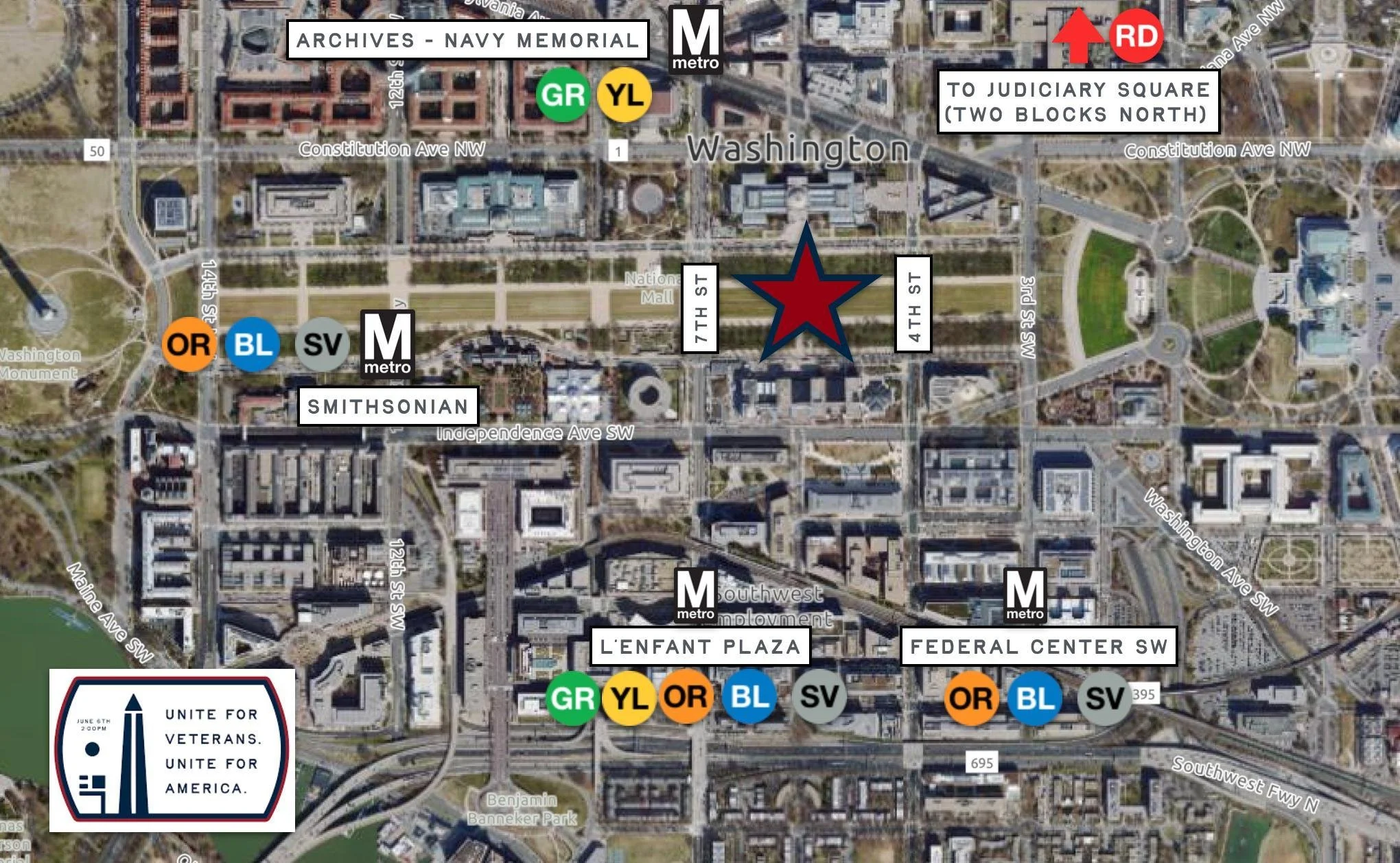 The Unite for Veterans, Unite for America Rally will be held in the center of Washington DC on the National Mall - the event stage will be just north of the Smithsonian National Air and Space Museum where 6th Street crosses the Mall. See below for detailed transportation guidance: